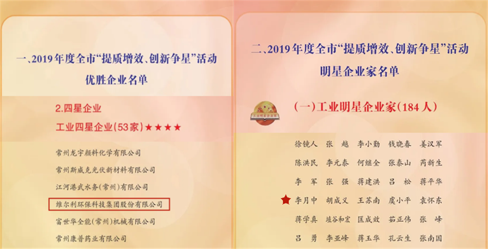 2020年3月10日,在常州市委、市政府召開的全市“重大項目強化攻堅年”動員大會上,維爾利環保集團榮獲2019年度常州市“工業四星企業”稱號,董事長李月中先生被授予2019年度常州市“工業明星企業家”榮譽稱號。這次評選結果為維爾利環保集團成績斐然的2019年畫上了圓滿的句號,更為2020年的發展繪下美好的開篇。