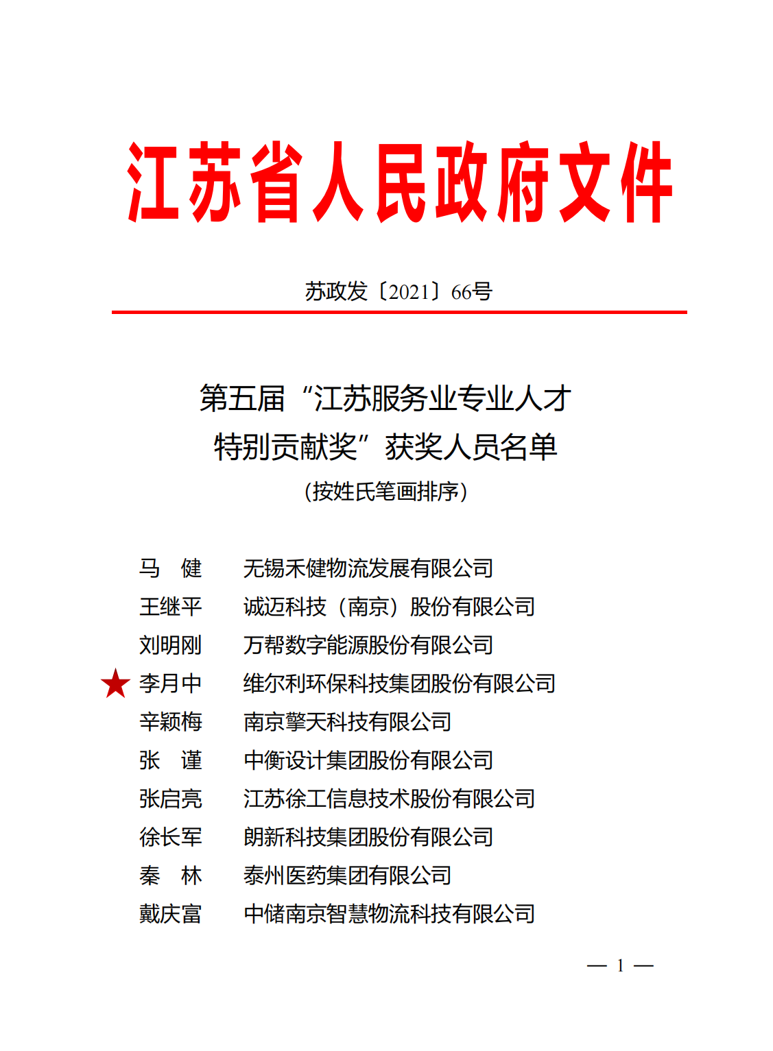 近日,江蘇省人民政府發布第五屆“江蘇服務業專業人才特別貢獻獎”獲獎人員名單,本次共表彰10人,維爾利環保科技集團股份有限公司董事長李月中先生成功入選。